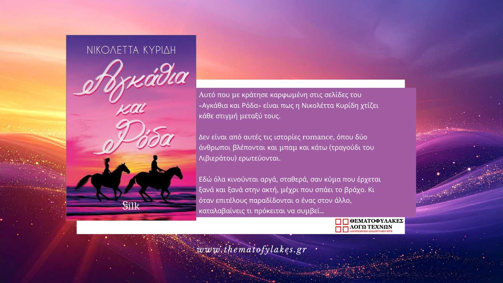 Αυτό που με κράτησε καρφωμένη στις σελίδες του «Αγκάθια και Ρόδα» είναι πως η Νικολέττα Κυρίδη χτίζει κάθε στιγμή μεταξύ τους. Δεν είναι από αυτές τις ιστορίες romance όπου δύο άνθρωποι βλέπονται και μπαμ και κάτω (τραγούδι του Λιβιεράτου) ερωτεύονται. Εδώ όλα κινούνται αργά, σταθερά, σαν κύμα που έρχεται ξανά και ξανά στην ακτή, μέχρι που σπάει τον βράχο. Κι όταν επιτέλους παραδίδονται ο ένας στον άλλο, καταλαβαίνεις τι πρόκειται να συμβεί…