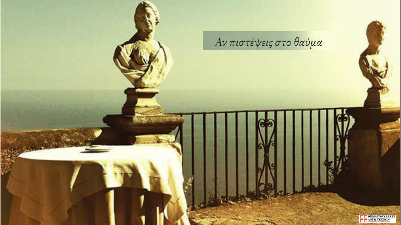 Ξεκινώντας από τους έρηµους δρόµους στο καλοκαιρινό Παρίσι και φτάνοντας ως τις ηλιόλουστες ακτές της Ιταλίας, µε ενδιάµεσους σταθµούς κάποια κοντινά και µακρινά νησιά, από το Αιγαίο έως την Ιαπωνία, το Αν πιστέψεις στο θαύµα είναι η ιστορία ενός άντρα που σώζεται χάρη στη µνήµη της παιδικής του ηλικίας και στη δύναµη των µύθων, των ιστοριών και της λογοτεχνίας. Ενός άντρα που σύντοµα θα καταλάβει ότι, επιτέλους, µπορεί να ξεφύγει από τον πόνο και να επιστρέψει στη ζωή.