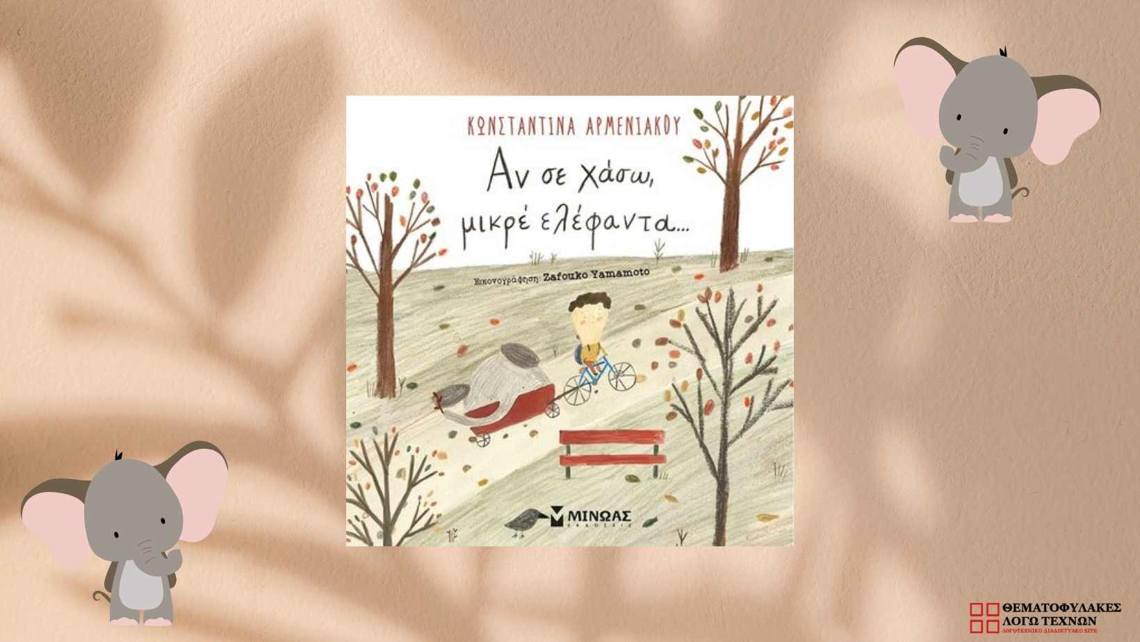 Από τις Εκδόσεις Μίνωας κυκλοφορεί το νέο εικονογραφημένο βιβλίο της Κωνσταντίνας Αρμενιάκου «Αν σε χάσω, μικρέ ελέφαντα…». Οι υπέροχες εικόνες του βιβλίου είναι της Zafouko Yamamato. Απευθύνεται σε ηλικίες 3+.