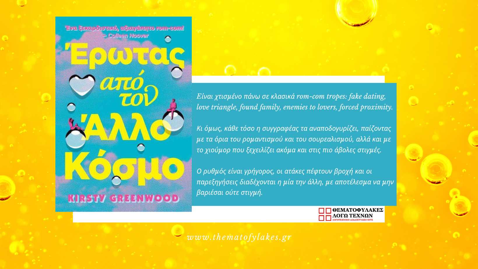 Το «Έρωτας από τον Άλλο Κόσμο» είναι χτισμένο πάνω σε κλασικά rom-com tropes: fake dating, love triangle, found family, enemies to lovers, forced proximity. Κι όμως, κάθε τόσο η συγγραφέας τα αναποδογυρίζει, παίζοντας με τα όρια του ρομαντισμού και του σουρεαλισμού, αλλά και με το χιούμορ που ξεχειλίζει ακόμα και στις πιο άβολες στιγμές. Ο ρυθμός είναι γρήγορος, οι ατάκες πέφτουν βροχή και οι παρεξηγήσεις διαδέχονται η μία την άλλη, με αποτέλεσμα να μη βαριέσαι ούτε στιγμή.