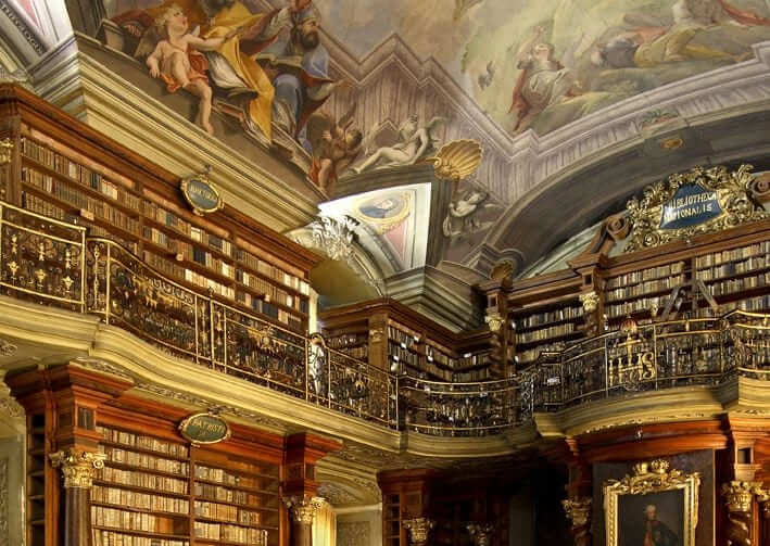 Η βιβλιοθήκη Klementinum, ένα εξαιρετικό παράδειγμα μπαρόκ αρχιτεκτονικής, με ξύλινη επένδυση, άνοιξε τις πύλες της το 1722 ως μέρος του πανεπιστημίου Ιησουιτών της Τσεχίας (το τρίτο μεγαλύτερο κολέγιο Ιησουιτών στον κόσμο) και στεγάζει πάνω από 20.000 βιβλία. Ψηφίστηκε ως μια από τις ομορφότερες και πιο μεγαλειώδεις βιβλιοθήκες στον κόσμο.