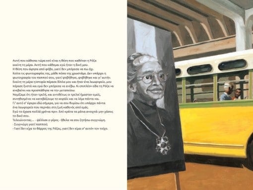 Του διηγείται επίσης πώς, την 1η Δεκεμβρίου του 1955 στο Μοντργκόμερυ της Αλαμπάμα, μια γυναίκα, η Ρόζα Πάρκς, αρνήθηκε να δώσει τη θέση της στο λεωφορείο σε έναν Λευκό και ξεκίνησε έτσι το κίνημα των πολιτικών δικαιωμάτων των Μαύρων στις ΗΠΑ. Μια ιστορία που ο παππούς ξέρει από πρώτο χέρι: ήταν εκείνο το βράδυ στο ίδιο λεωφορείο, καθόταν δίπλα στη Ρόζα, αλλά δεν είχε το κουράγιο της.