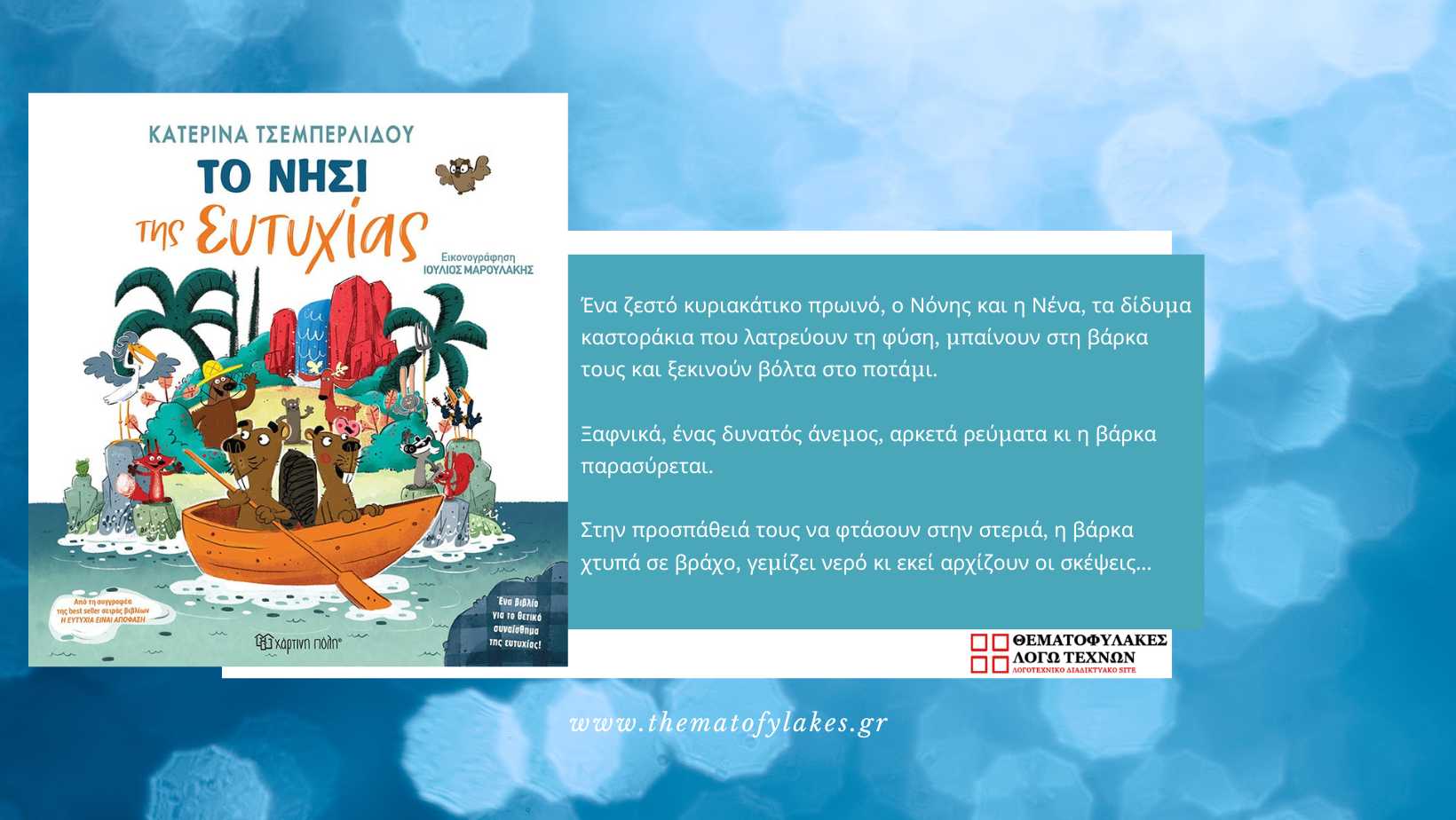 Τα δίδυμα καστοράκια, ο Νόνης και η Νένα, ταξιδεύουν ως «Το Νησί της Ευτυχίας» της Κατερίνας Τσεμπερλίδου. Η εικονογράφηση ανήκει στον Ιούλιο Μαρουλάκη. Κυκλοφορεί από τις Εκδόσεις Χάρτινη Πόλη. Απευθύνεται σε παιδιά άνω των 4 ετών.
